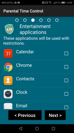 After this it proposes to choose the Entertainment applications from the list of installed applications. The using of these apps will be limited. You can choose them later.
