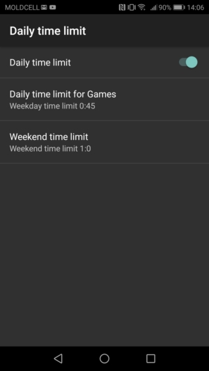 Parental Time Control provides to limit time spent in games. Turn the option Daily Time Limits on. By default, the program will allow use of games for 45 minutes on a weekday and one hour on weekends. This option can be changed, you need only tap the corresponding line. The using of Entertainment applications will be limited.