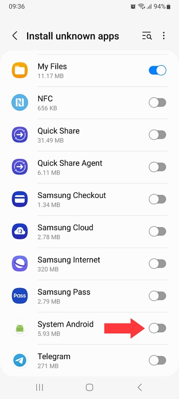 В следующем окне Включите переключатель напротив System Android и разрешите установку программ из этого приложения.